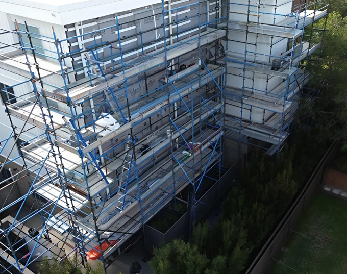 A technical build for recladding of external faces requiring multiple stages of building and stripping to work from top to bottom. Built for Vaughn Development